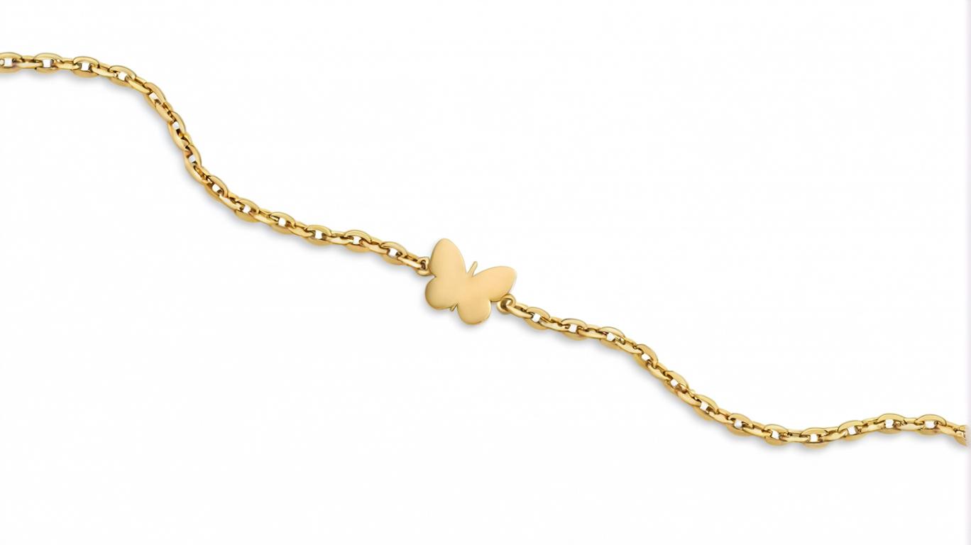 Brățara este confecționată din aur de 14 karate și are un design elegant, cu un detaliu distinctiv sub formă de fluture.