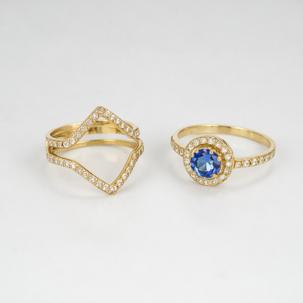 Inelul principal este decorat cu un safir central de 0,82 ct, cu o nuanță intensă de albastru, care atrage privirea și conferă bijuteriei un aspect elegant și regal. Piatra centrală este pusă în valoare de 68 diamante albe naturale, care amplifică strălucirea și creează un efect spectaculos de lumină.