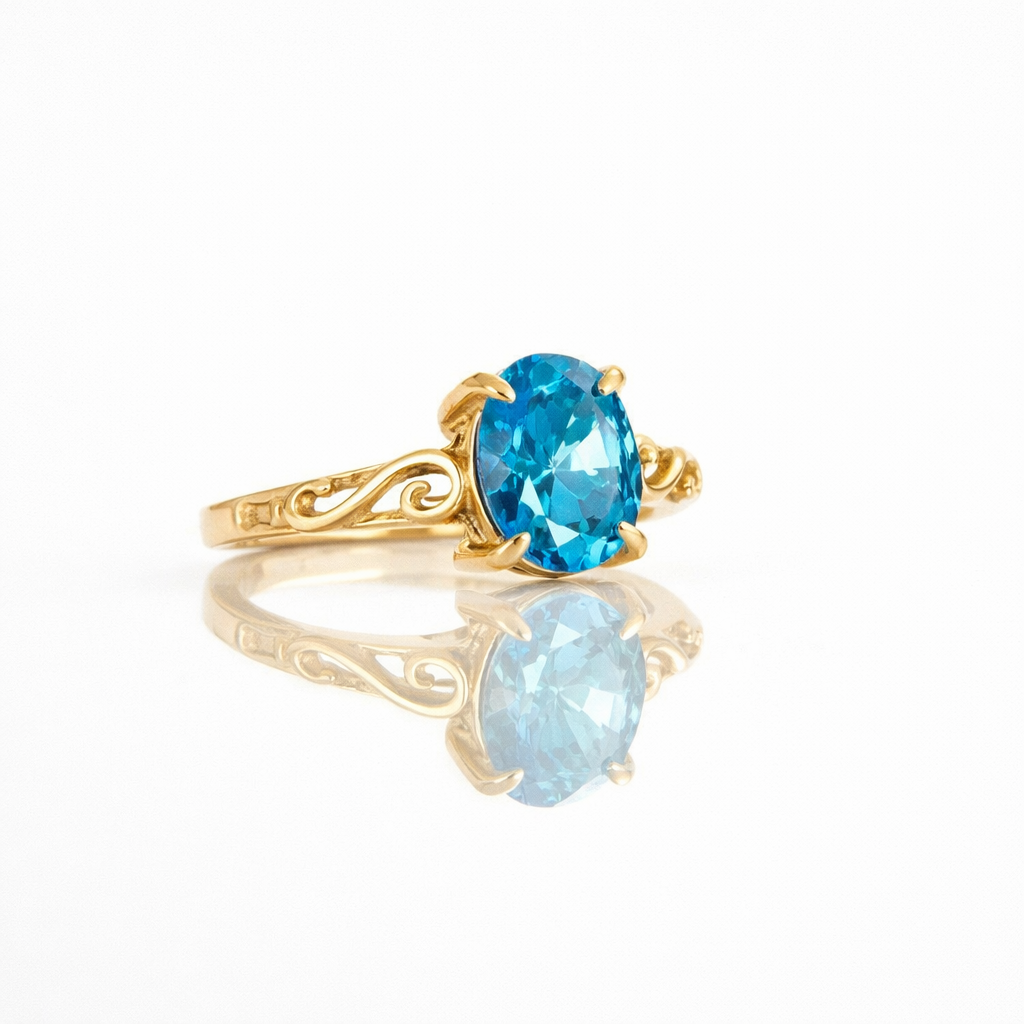 Elegant și rafinat, acest inel din aur galben 14K impresionează prin designul său clasic și prin piatra centrală de formă ovală, care oferă bijuteriei un aspect sofisticat și plin de farmec. Montura delicată evidențiază frumusețea pietrei, iar brațul inelului este decorat cu detalii ornamentale fine, inspirate din designul clasic al bijuteriilor.